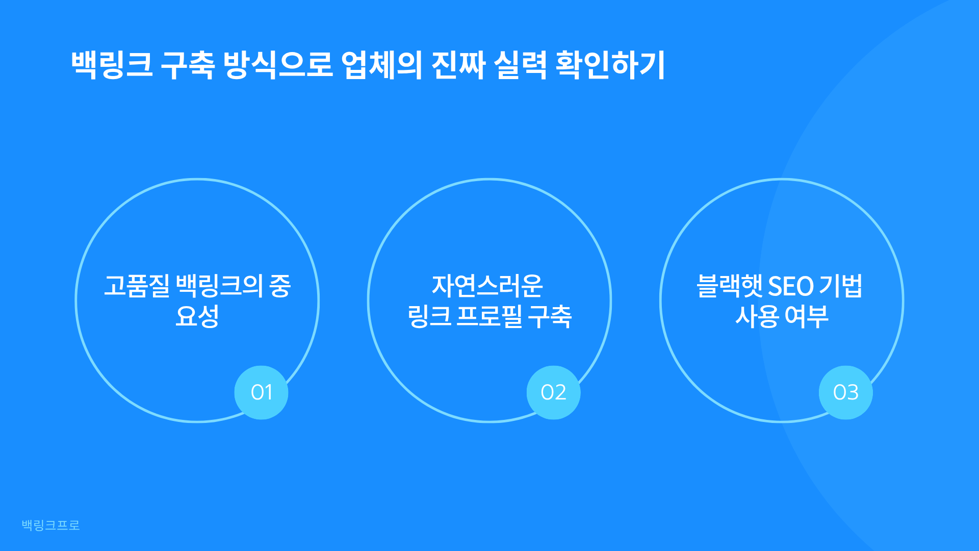 업체를 선정할 때는 반드시 백링크 구축 방식을 구체적으로 질문해야 합니다. 어떤 사이트에서 링크를 확보하는지, 링크의 앵커텍스트는 어떻게 설정하는지, 월별로 몇 개의 백링크를 생성하는지 물어보세요. 명확한 답변 없이 결과만 강조하는 업체는 피하는 것이 현명합니다.