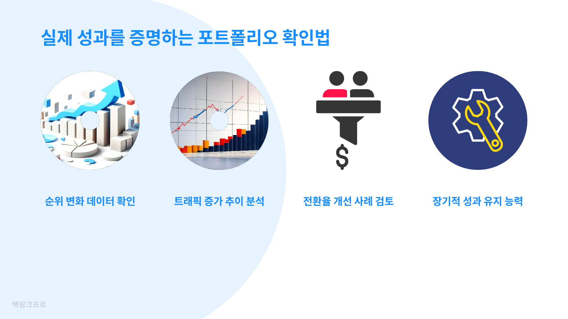 특히 주의해야 할 점은 경쟁 강도가 낮은 키워드만 골라서 실적을 부풀리는 경우입니다. 월간 검색량이 100도 안 되는 키워드로 1위를 달성했다고 해서 그것이 진정한 SEO 역량을 보여주는 것은 아닙니다. 해당 업종에서 실제로 매출과 연결되는 핵심 키워드를 다뤄본 경험이 있는지 반드시 확인해야 합니다. 포트폴리오에서 확인할 수 있는 몇 가지 핵심 체크리스트로는, 실제 검색 결과의 변화, 주요 키워드의 순위 상승, 트래픽 증가, 그리고 전환율 개선 등이 있습니다.