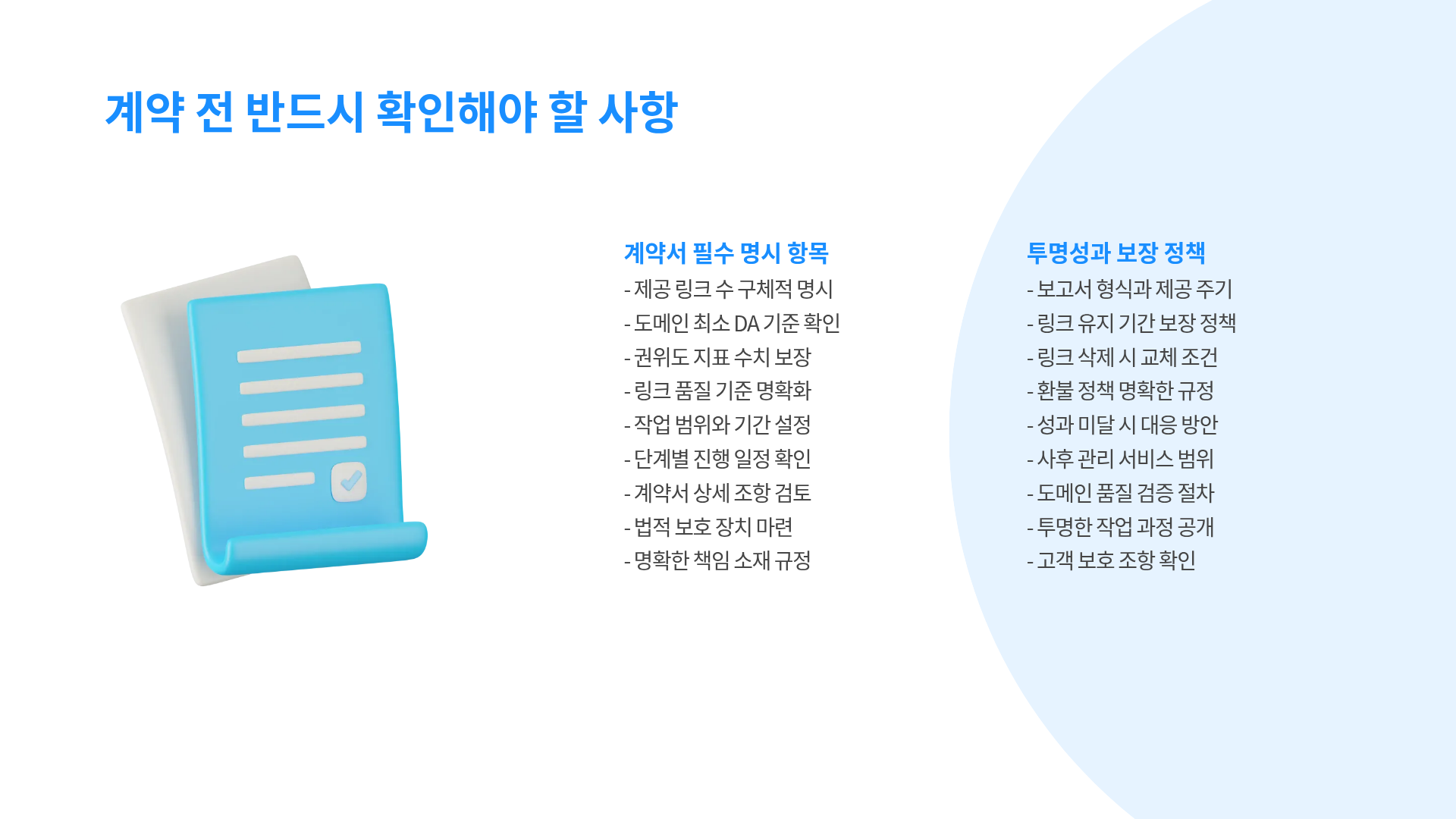 계약서 작성 시에는 제공 링크 수, 도메인 최소 DA 기준, 보고서 형식, 링크 유지 기간, 환불 정책을