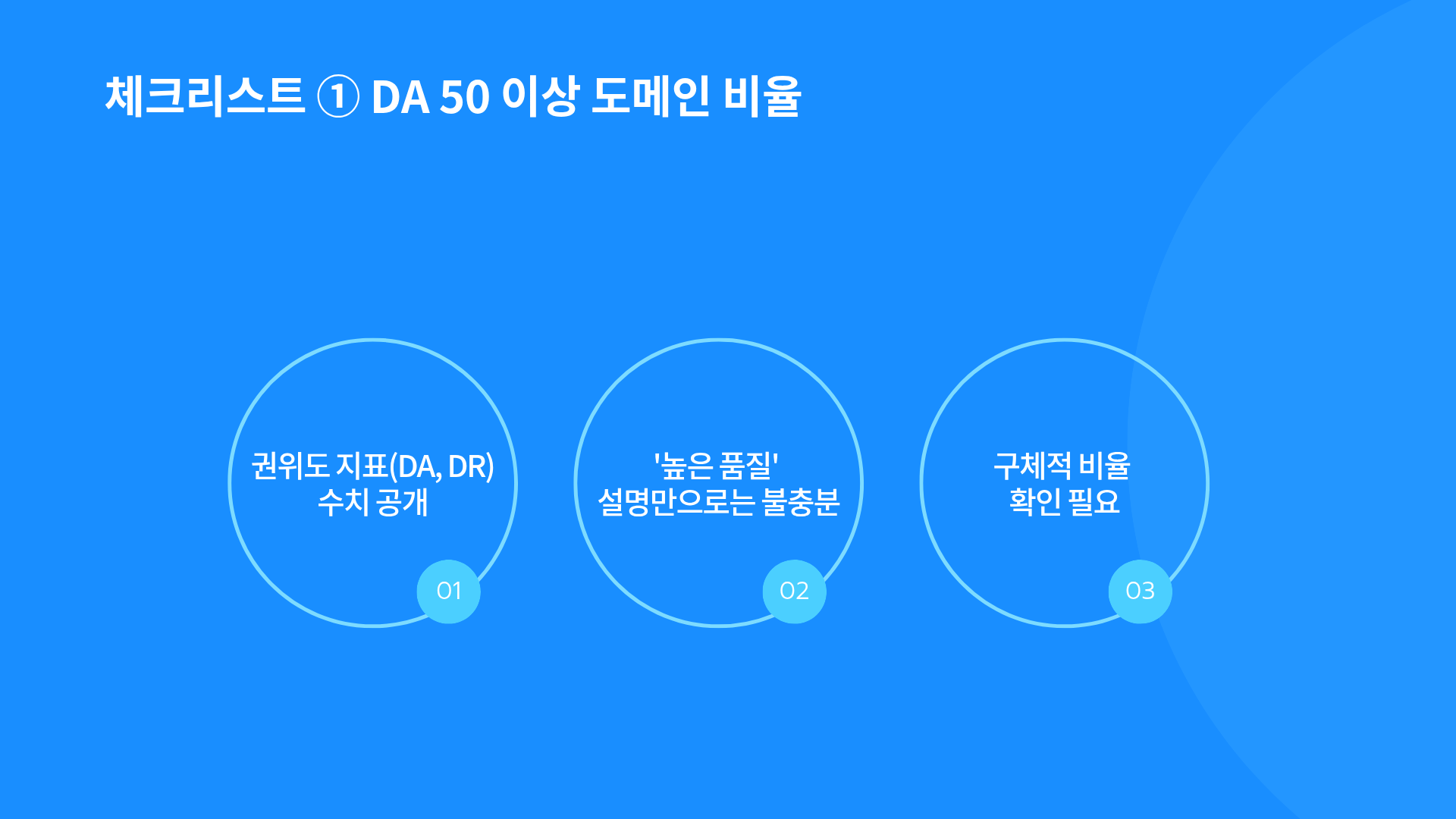 ① DA 50 이상 도메인 비율 공개 여부 제공하는 링크의 권위도 지표(DA, DR)를 수치로 공개하는지 확인합니다. “높은 품질”이라는 설명만으로는 충분하지 않습니다.