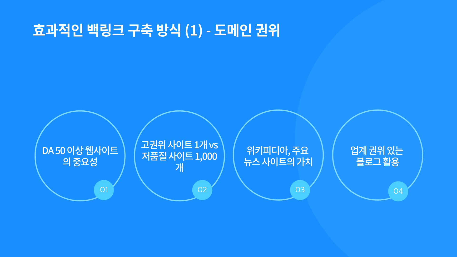 DA 50 이상의 웹사이트에서 백링크를 받는 작업은, DA 10 미만의 스팸 사이트 1,000개에서 받은 링크보다 SEO 효과가 훨씬 큽니다. 위키피디아, 주요 뉴스 사이트, 업계 권위 있는 블로그에서의 언급이 여기에 해당합니다.