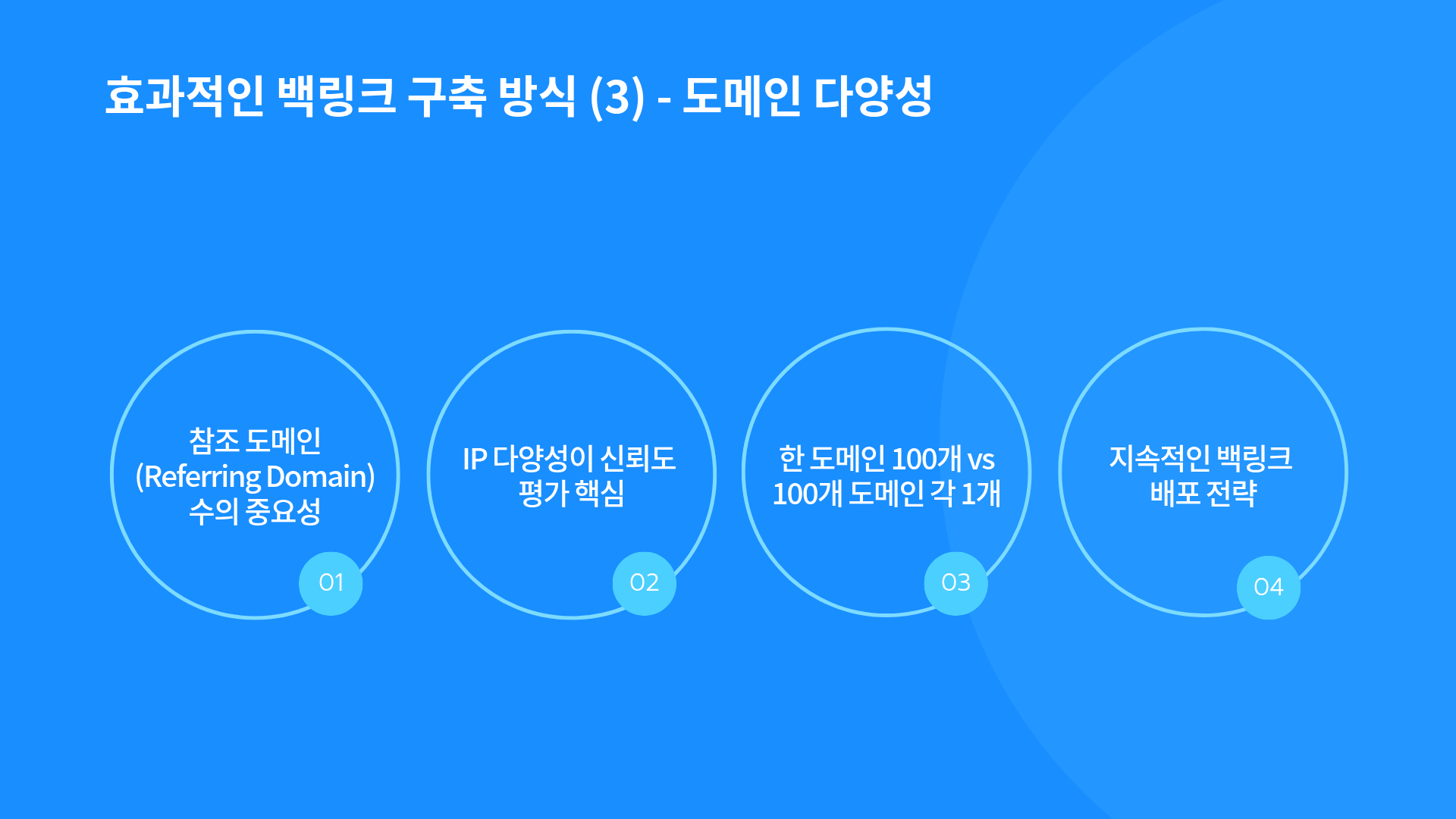 링크를 제공하는 참조 도메인(Referring Domain)의 수와 IP 다양성은 구글이 신뢰도를 평가하는 핵심 요소입니다. 한 도메인에서 100개보다, 100개 도메인에서 각 1개씩 배포하는 것이 훨씬 더 많은 효과를 가져옵니다.